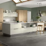 This kitchen combines smooth painted matt colours and an elegant handleless design.